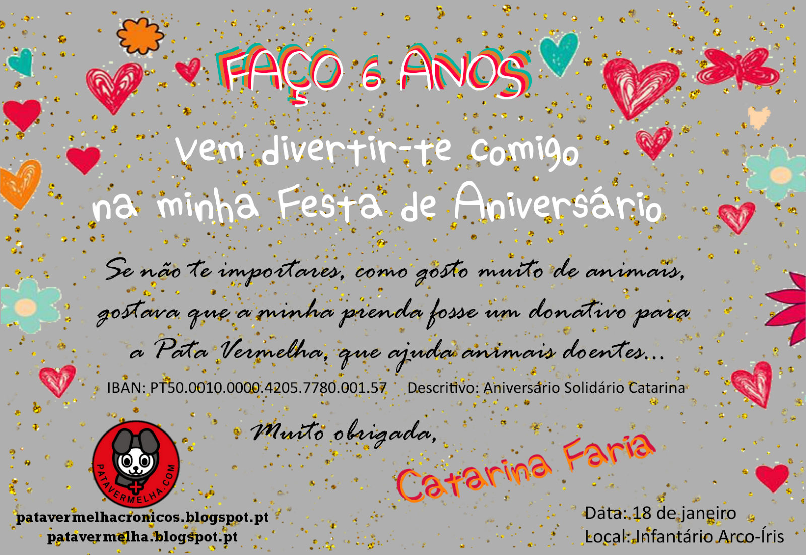 A Catarina faz 6 aninhos no próximo dia 18 de Janeiro, e, como adora animais, decidiu pedir aos seus amigos e familiares para lhe darem de prenda um donativo para a Pata Vermelha. Assim, a prenda da Catarina será ajudar peludinhos que precisam de medicação e cuidados de saúde!